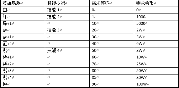 英雄晋级,需要消耗英雄徽记,提升品质可以解锁英雄技能,并且增加部分属性。