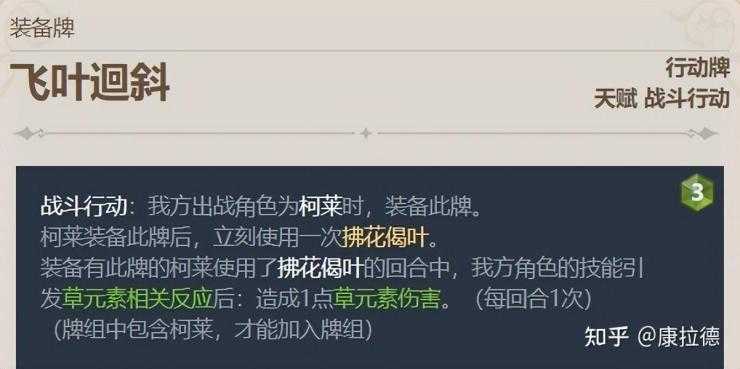 科莱的命座,飞叶迴斜(3白)极其超模。此命座首先不亏费(大多数命座都亏1费),其次是高贵的草伤,而且提供的这点草伤害享受激化的加成,以一己之力造就了6骰打10血的开服神话,基本天梯里人人都被这一套见面杀过。
