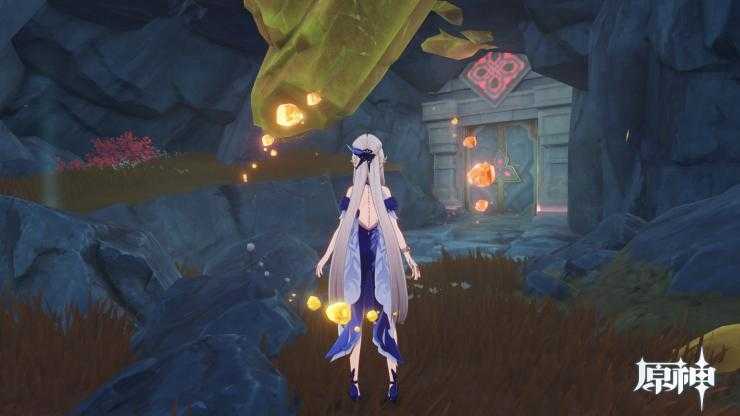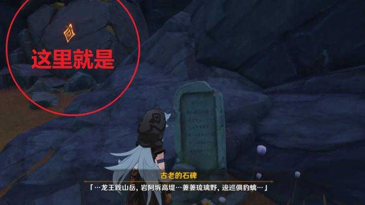 4、岩中幽谷副本所在山洞门口有一块石碑,封堵山洞的大石头上有明显的岩元素标志。