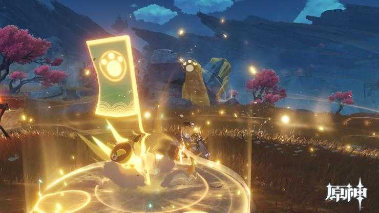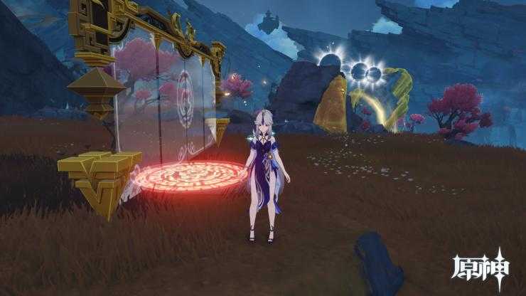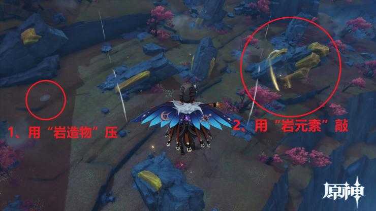 第四步,用岩元素敲击“大石头”。如果你从完成机关1到完成机关2的速度足够快的话,就可以成功解锁新开的岩中幽谷副本啦!