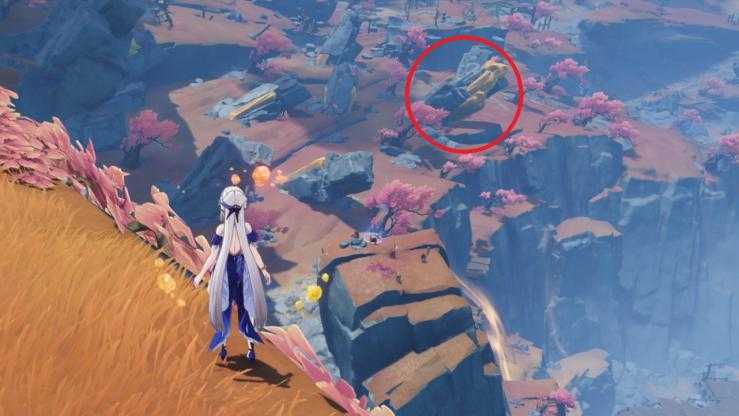2、靠近山崖向下望去,就可以看到一块比较大的“黄袍加身”的特殊石头。这个石头是可以敲的,但是要用“岩元素”。它也是我们开启岩中幽谷副本的机关之一。