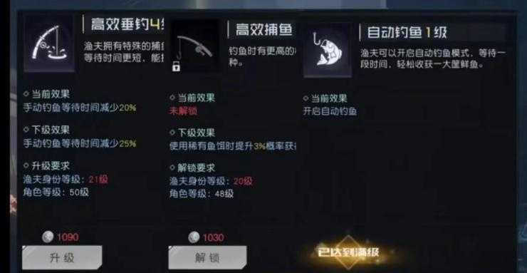 渔夫:钓鱼速度更快、钓出稀有鱼速度更高、5级解锁自动钓鱼