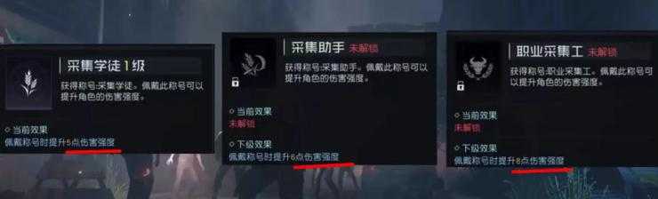 采集身份:伐木工、挖矿工、采集工、猎人(熟练度获取上限每天1000点经验,升级的经验随身份等级增加而增加)不同的身份给予玩家不同的便利,砍树爆率更高更快,挖矿爆率更高更快。(称号伤害强度加成都是加5