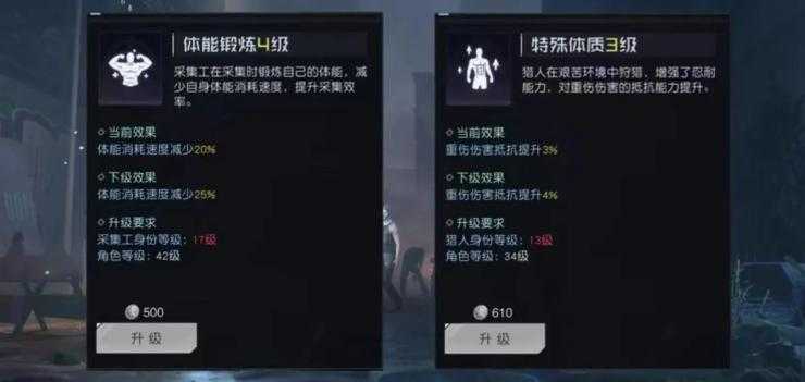 二、(对战斗有帮助,看情况选择)采集工体能锻炼:体能消耗速度减少。猎人特殊体质:重伤伤害抵抗提升