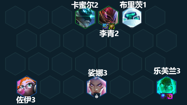 阵容组成:卡蜜尔、李青、布里茨、佐伊、娑娜、乐芙兰