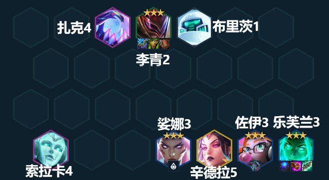 阵容组成:扎克、李青、布里茨、索拉卡、娑娜、辛德拉、佐伊、乐芙兰