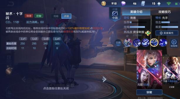 三技能:秘术 影解析:(本体形态)元歌拉出十字丝线对命中的敌人造成伤害,放出技能的同时自身会反向位移一段距离,该技能可以穿墙,如果被两条丝线命中, 将会造成额外已损生命16%的物理伤害和50%减速效果持续2秒。