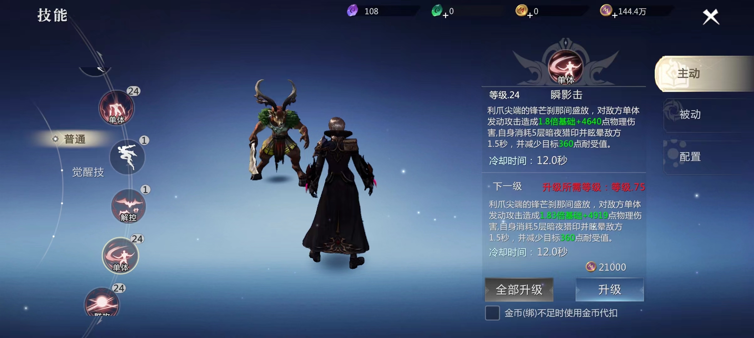同时我们就可以着手搞技能、装备和幻兽了,一是为了提升战力避免打怪刮痧,二是部分金色装备和幻兽后期照样能继续用。技能方面,暗夜君主推荐优先把资源投入到幻月闪、瞬影击和暗影轮回这三个技能上。暗影轮回是70级解锁的连招,有条件拿到技能书的小伙伴一定要解锁;幻月闪是暗夜君主为数不多的群攻技能,前中期清杂全靠它;瞬影击则是高倍率对单技能,在中期就能造成六位数的伤害,属于对BOSS和精英怪神技。