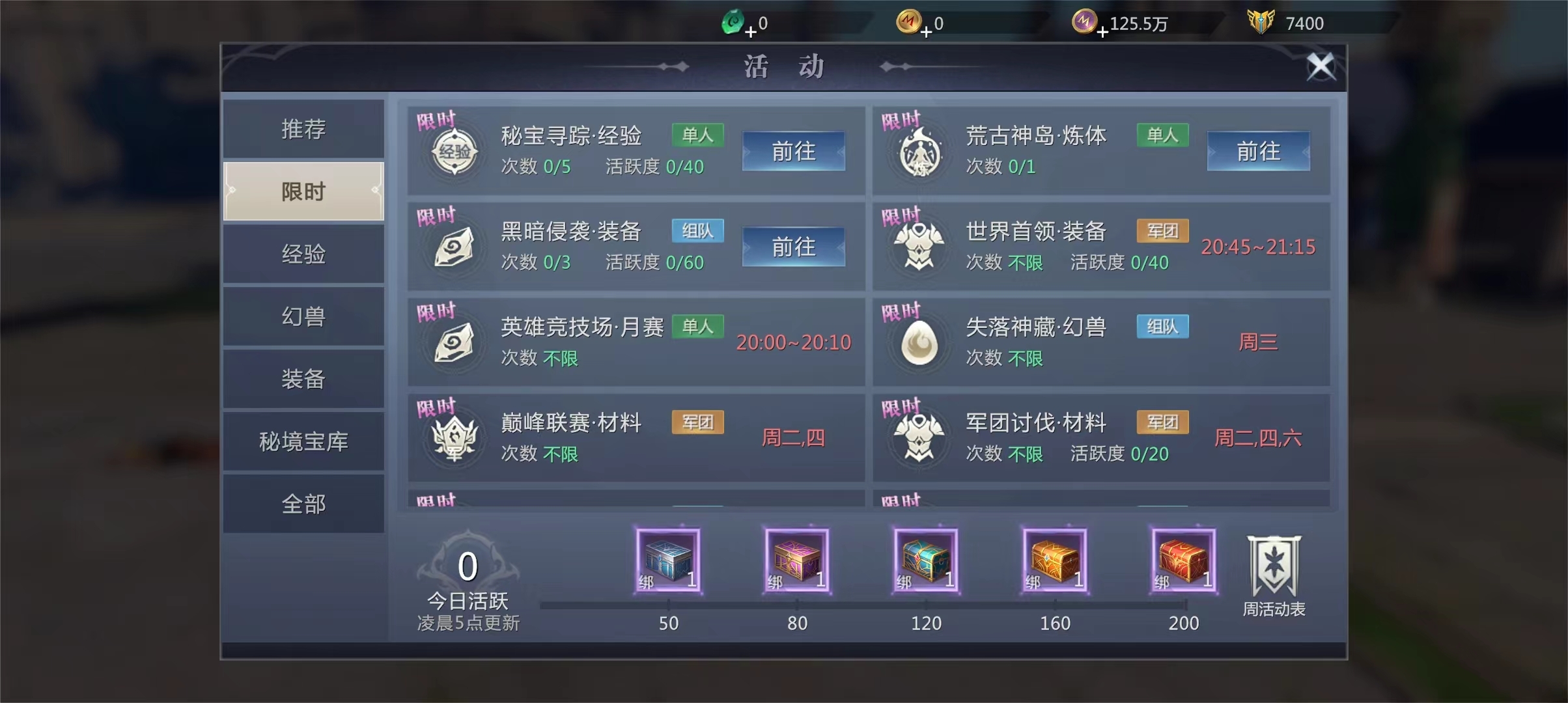 最后是装备方面。优先强化金色装备,而过渡用的紫色装备强化到+10就差不多了,蓝色装备直接忽略升级,有更高品质的就直接换。比起升级,中期更看重的是装备的获取,这里给大家推荐一个不容易遗漏的刷装备方式,点开活动页面,将推荐和限时两栏的副本全清即可,顺带还能完成日常任务获得更多奖励。