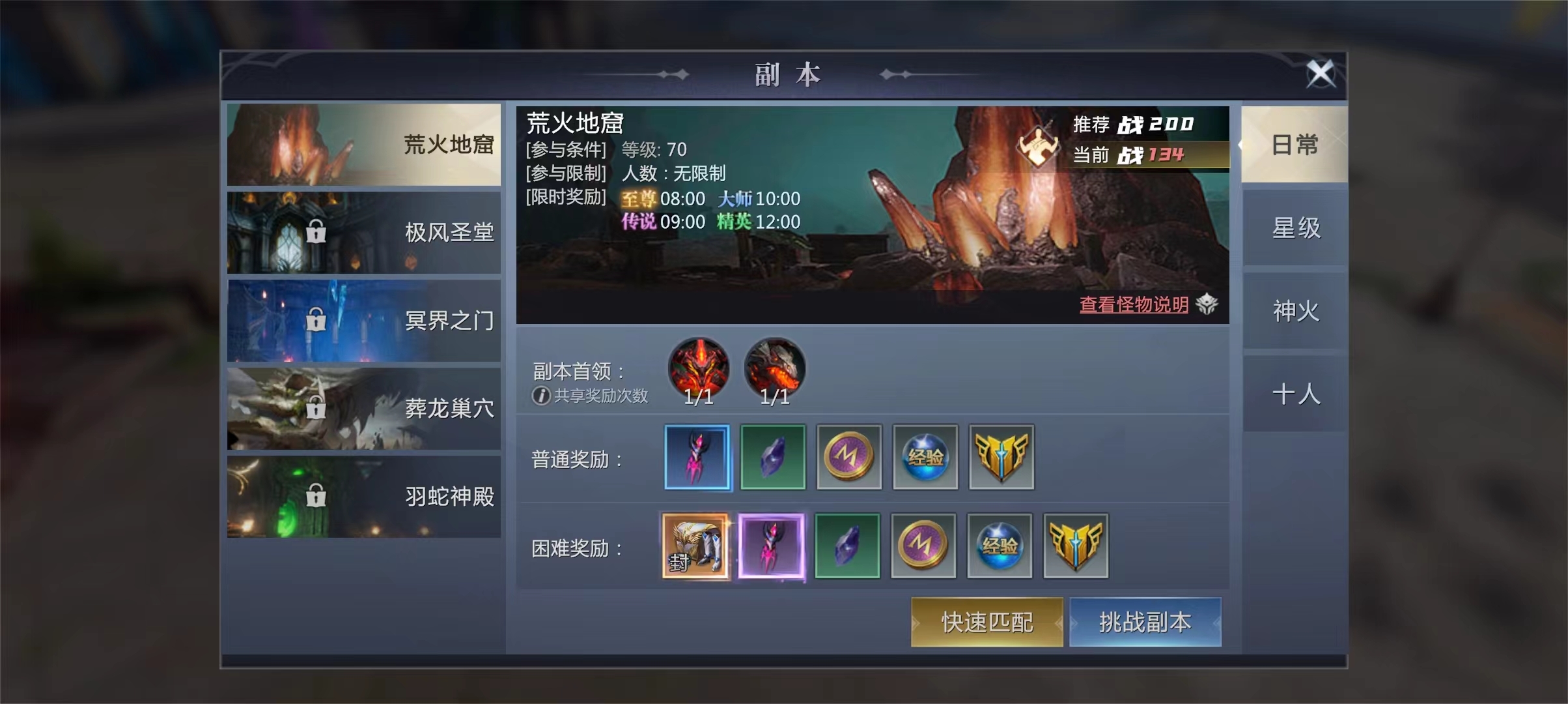 来到70级后,游戏也算进入中期了,因为不仅解锁了新主线和支线,还有连招系统、几个关键的新副本等一众功能。除了继续升级外,70级后每天必刷一遍副本荒火地窟,就算打不过拉上大腿组队也要打困难难度。因为无论装备还是经验奖励,荒火地窟都是前中期性价比最高的副本,没有之一。