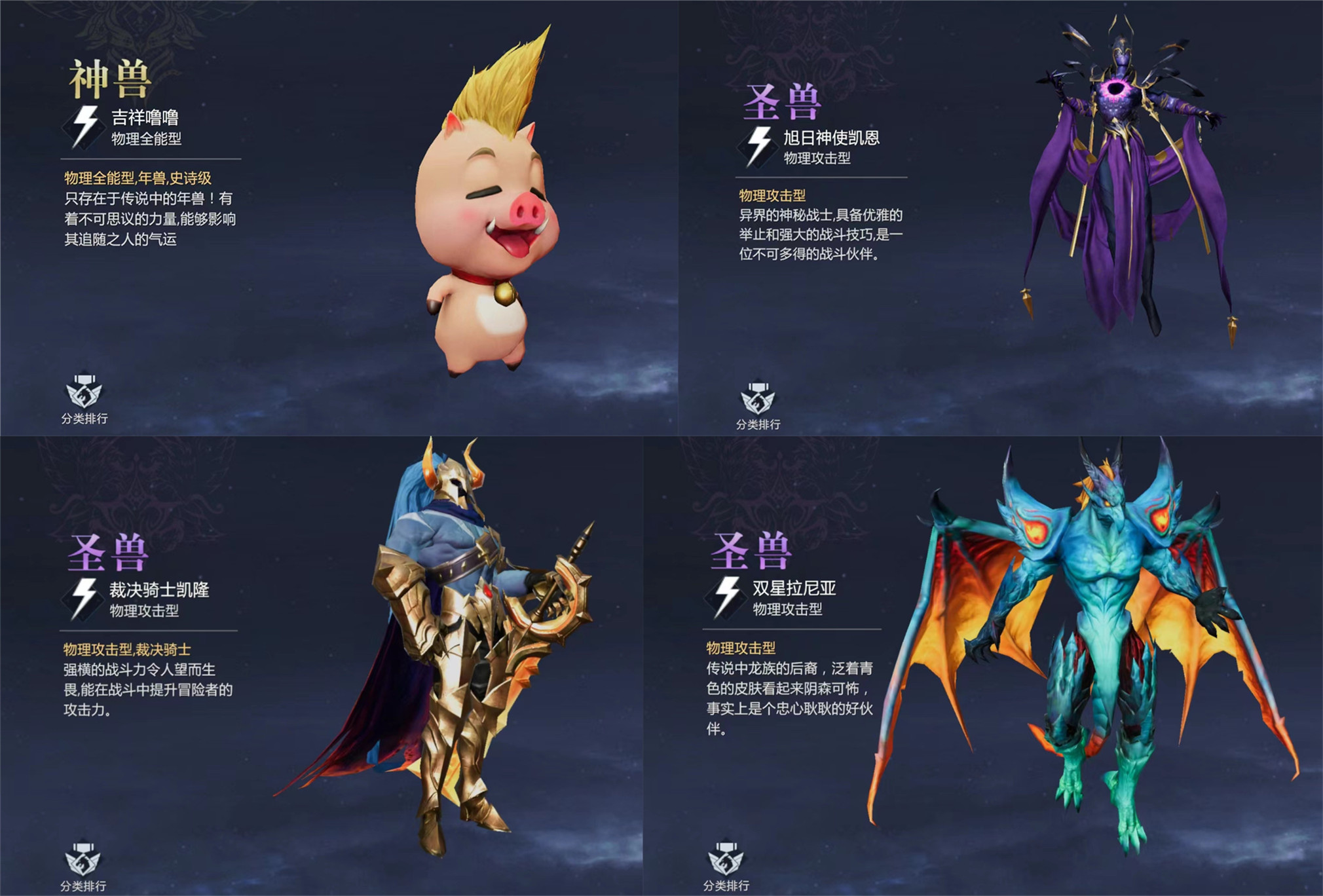 然后是幻兽方面,前中期暗夜君主原生宠暗魂守卫奥伦就够用了,记得幻化升级,主升主属性即可,副属性和初始值不急着升。有条件或者从游戏奖励获取到高品质幻兽的话也可以尽早培养。想要进一步发挥幻夜君主的优势,幻兽属性当然是物理输出相关的类型让伤害达到极致,这里给大家推荐四只:吉祥噜噜、旭日神使凯恩、裁决骑士凯隆、双星拉尼亚。