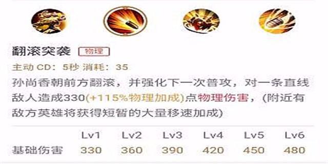 整体分析:一技能是孙尚香的核心位移技能,也是孙尚香的核心输出技能。一技能释放之后,其实会有两次射程增强的普通攻击。第一次普攻射程和伤害都有强化,享受一技能的强化伤害,而且对一条直线上的敌人会造成伤害。第二次普攻会有强化的射程,但是伤害没有加成。翻滚后会获得移速加成,可以利用一技能的这个特点来探知草丛是否有敌方英雄存在。