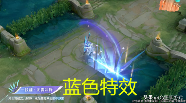 局内效果,该皮肤在局内是单翅膀的设计,因为服饰主调色为蓝色,所以在局内的显得体格并不是很魁梧,普攻释放之后会出现蓝色和黄色的晶体特效,和武器的非常的契合,一技能释放之后项羽的正面会形成一个屏障的特效,之后地上会出现蓝色晶体,识别度还是很高的,二技能释放并没有太亮眼的特效,自身周围出现蓝色特效和红色花瓣,当时专精装的二技能会有金色特效出现,大招是这款的一大亮点,技能释放之后全屏都会出现蓝色特效,并且会有飞行器出现,攻击路径上目标,而该技能因为特效的原因,看上去攻击范围要大很多。