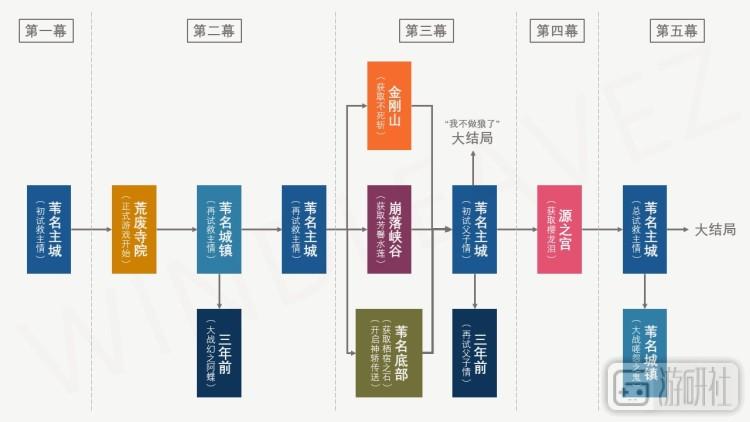 从《只狼》的游戏流程来看,整个游戏被划分为五幕。第一幕是序章部分,第二幕是再次营救主人,第三幕是寻找开启仙界通道的三种道具,第四幕是获取斩断不死的龙泪,第五幕是与游戏的最终敌人决一死战。游戏里所有的地图,都被安排在这五幕结构里。