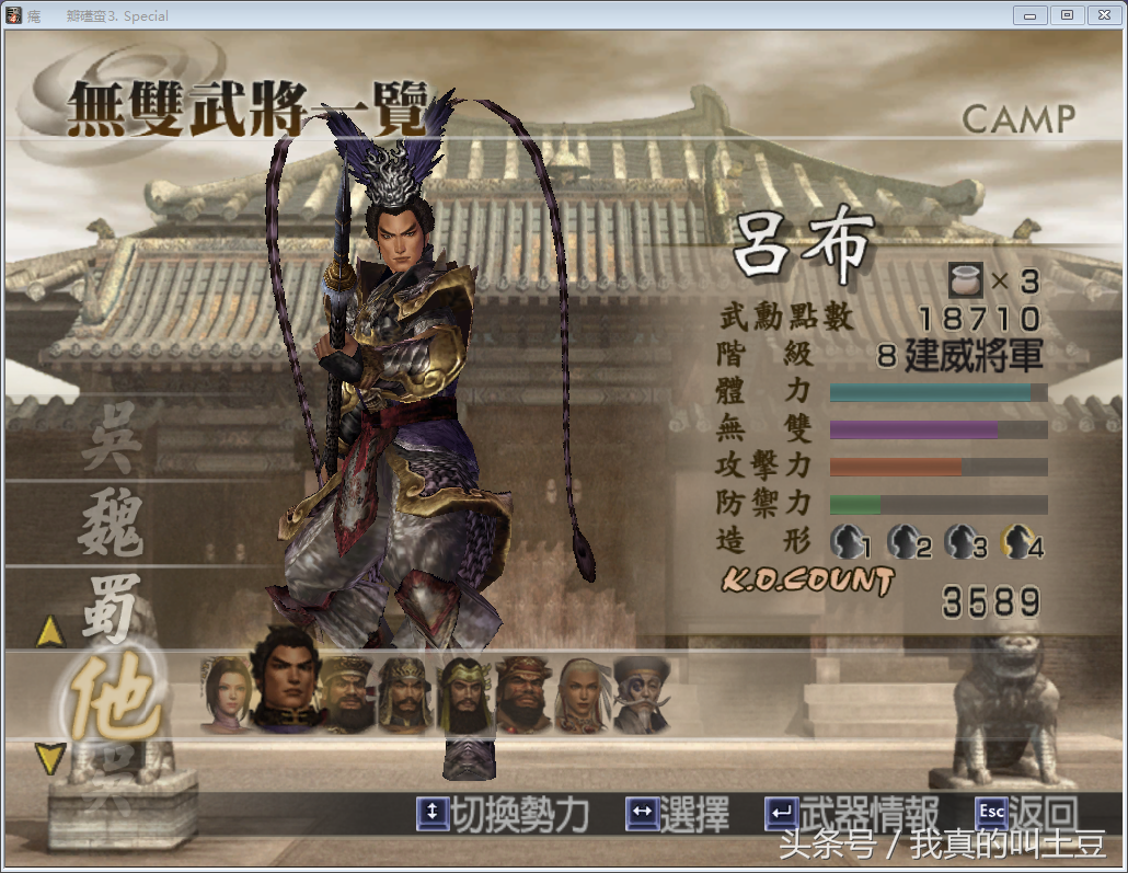 困难难度还是比较难打的,如果你的角色属性还没打满的话,还是要小心一点,谨防被敌将一套打残或者秒杀导致败北,选择武将角色吕布。