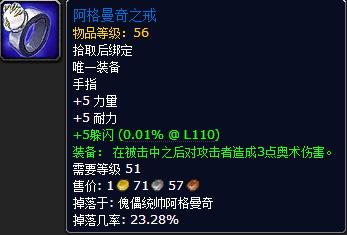 阿格曼奇之戒:来自于D2和D3的拿各的戒指/纳格尔之戒,D2中这枚戒指拥有很高的MF属性。魔兽的阿格曼奇之戒和D2种的拿各的戒指都有对攻击者造成3点伤害的奇妙属性。
