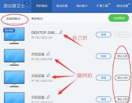 然后看到“在线设备”中的一堆设备,除自己的外,全部点“禁止上网”,这样就踢出了所有的蹭网者了。