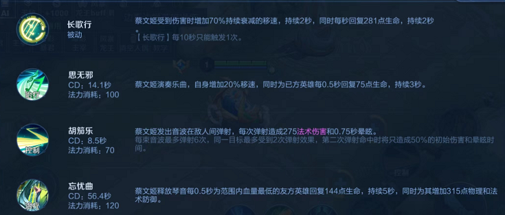 游走位置在峡谷里可以说是至关重要的,咱们在排位禁英雄的时候就会发现,一共六个禁位,最起码有三到五个都是辅助,这也从另一个方面体现了辅助英雄的重要性,这次给大家带来的就是一位很常见的辅助英雄,蔡文姬,首先我们看一下蔡文姬的技能