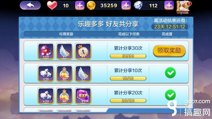 天天风之旅中有个分享的任务,分别是分享5、10、20、30次,会获得丰厚的奖励,下面小编就说说如何快速的完成分享任务吧。先完成一个关卡普通关卡,或者完成某个任务的时候,系统会弹
