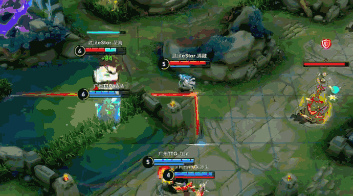 四人组在正面战场逼而不团、拉扯消耗,如果敌方五人始终留在正面战场纠缠,那么他们只能眼睁睁看着另一路被破塔推线。