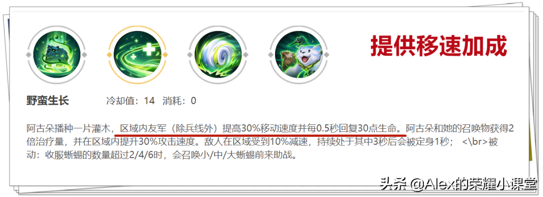 马超的移速越快、强化普攻和技能伤害就越高,而阿古朵一技能可以增加区域内所有队友30%-50%移动速度(随一技能等级成长)。