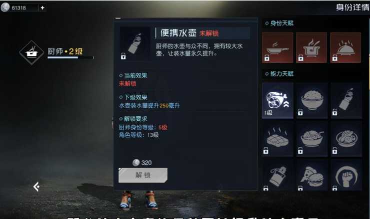 第五个厨师,生存食谱也是我目前解锁模型做得最漂亮的了。它也是四个食材搭配做出一碗饭双份料理。游戏中会渴,需要你去装水喝,水壶就可以提升这个容量。