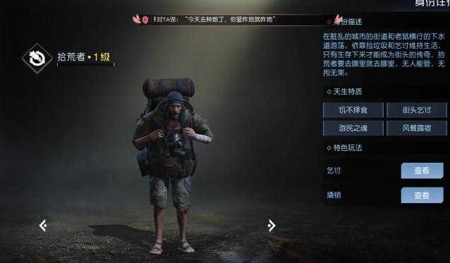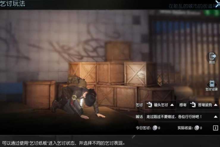 第7个拾荒者,这个有意思,只要有那个乞讨纸板之后,你就可以在路上求别的玩家去给你送东西,可以求钱或者抗感染药剂都行。它有磕头姿势和答谢姿势非常有趣。