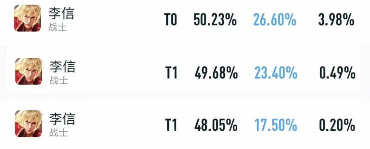 以上是李信最新的三大榜单数据,全分段,巅峰赛和顶端局依次排列。