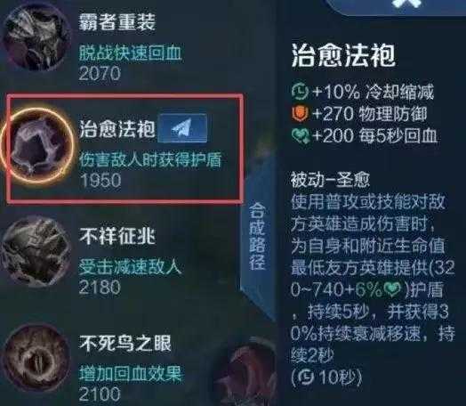 此外,新版本还有一件新的装备,被命名为“治愈法袍”,装备基础词条为10%冷却缩减、270物理防御和每5秒200点回血,属于比较另类的防御装备。