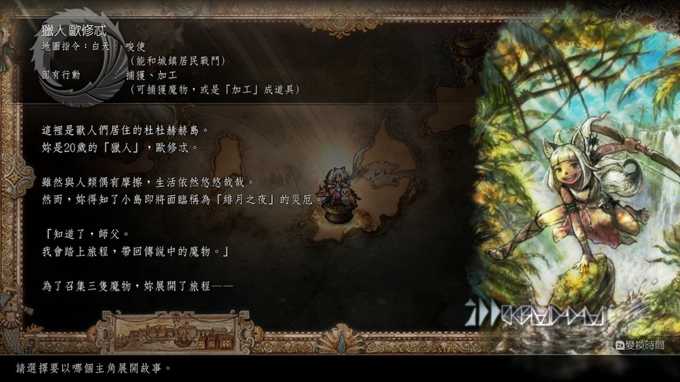 猎人的机制很丰富,而且很有趣,白天指令唆使,能够让魔物跟NPC战斗,只能派出魔物去咬NPC来打赢,晚上指令收服,这裡的收服不是收服魔物,是收服NPC,需要给道具,例如兽人村的NPC只要给他们肉乾,他们就会同行。