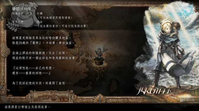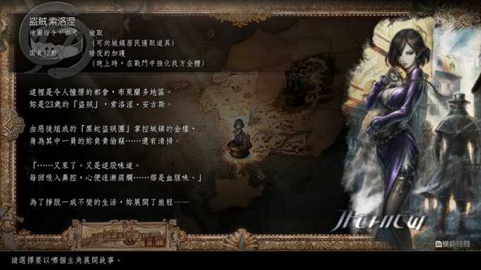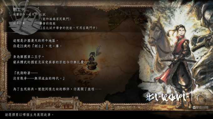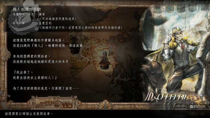 不过在开始介绍之前,要先来介绍一下这次歧路旅人2的新系统,这次可以切换时间,白天和晚上,只要按一个键就能轻松切换, 白天晚上地图上的NPC会不一样,每个职业的地图指令也会不一样,除此之外还有一个战斗时,可以释放每个角色的专有技能潜力,新系统大概就这样,那就立刻开始介绍八个职业吧。
