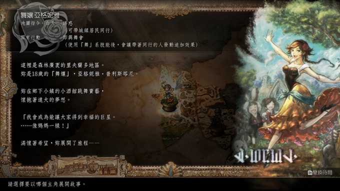 舞娘的名字为亚格妮雅,梦想是成为巨星,带给全世界的人幸福,一点一滴存钱,决定离开村子向世界迈出。