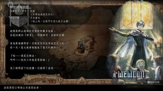 神官的名字为特梅诺思,工作为异端审问者,会质疑任何事情,作为神官的他甚至会质疑神,为了解开教会的谜团,他展开了旅行。