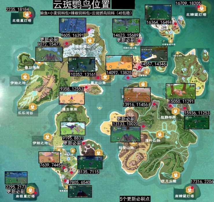 北极星灯塔(2235,18184)、北瞭望灯塔(16709,18205)、南极星灯塔(2295,2173)、南瞭望灯塔(17316,2206)、孤影雪山(9605,16391)(8072,15477)、暮光山角(10352,13161)、温玉草原(9358,12553)伊始之地(9195,8831)(7639,7445)(8135,7115)(7805,6540)、旧旅行者丘陵(14623,15689)、旧郁金香平原(16364,16494)、旧面包岛(14092,13825)(14557,14346)、牧野平原(15936,11253)(15050,11291)(13916,11456)、落叶山脉(13133,10020)