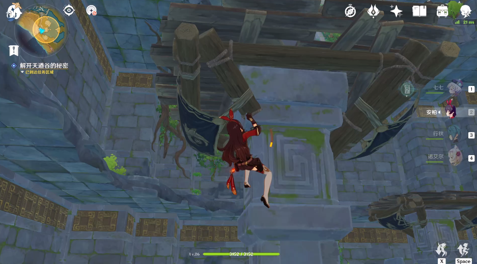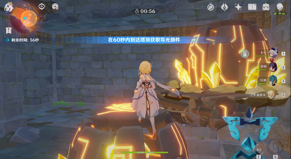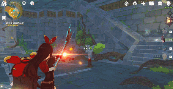 后来我摸索到了几种登上去的方法,不过因为某些限制,只有一种能用。就是将主角的属性转换为岩属性然后利用e技能在平台上制作石台,一层一层爬上去,不过也是好几次实行之后才在最后几秒险险完成。在挑战开启前可以利用主角的e技能在第一节平台上放两个石台,然后在开启挑战这样就比较省时间的,就是这样我还是在最后十秒才上的顶端、拿到线索。这个任务还是比较坑人的,能卡半天。