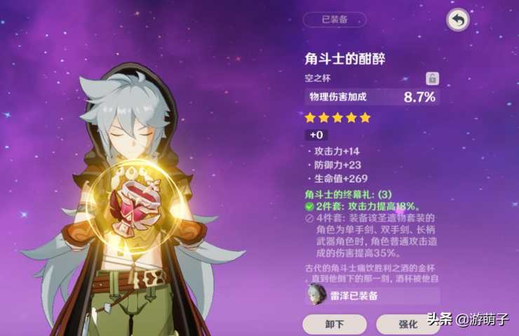 攻击伤害提高35%,因为雷泽是物理输出角色,他的突破都是加物理伤害,所以适合他的圣遗物是角斗士