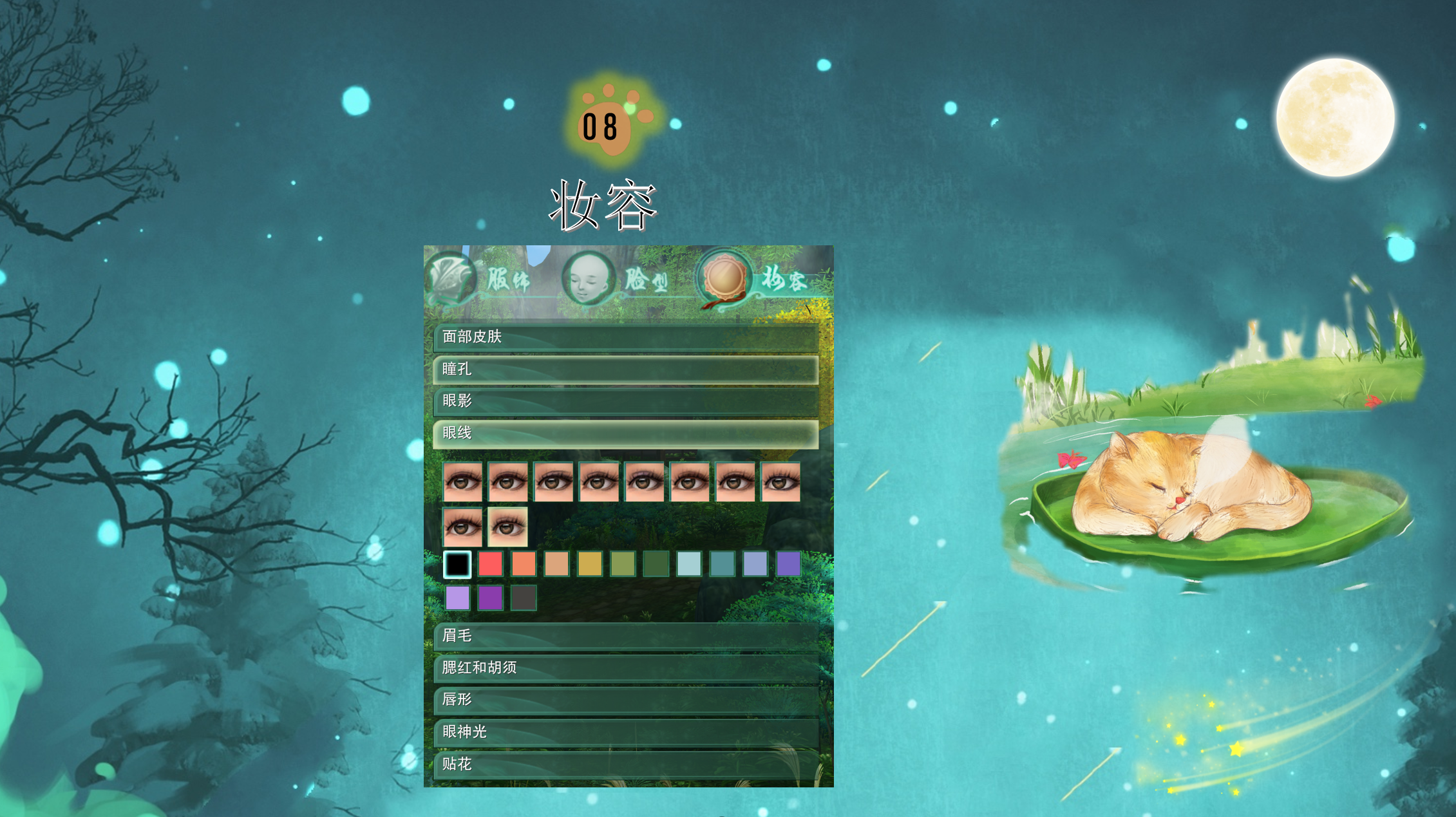 最后我们再看一下妆容,它分为:面部皮肤,瞳孔,眼影,眼线,眉毛,腮红(女),胡须(男),唇形,眼神光和贴花。