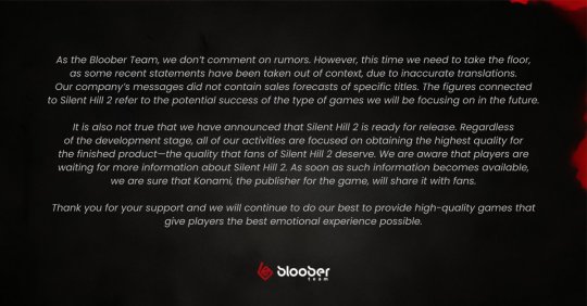 Bloober Team在文中说道:“我们宣布《寂静岭2》准备好发售不是真实的,无论开发阶段如何,我们所有的工作都专注于获得最高质量的成品——这是《寂静岭2》粉丝应得的。我们知道玩家们正在等待更多关于《寂静岭2》的信息。一旦这些信息可用,我们确信游戏发行商科乐美一定会与粉丝们分享。”
