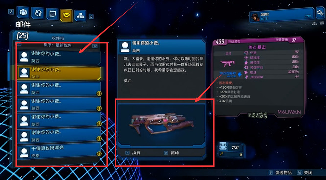 避难所莫西酒吧给小费,每次1000,给到发给你邮件为止,邮件可能包含两件武器奖励。