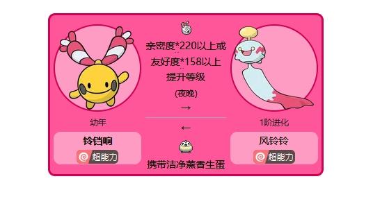 前一阶形态铃铛响,在夜晚(20:00~3:59)亲密度*220或158以上即可进化为风铃铃。
