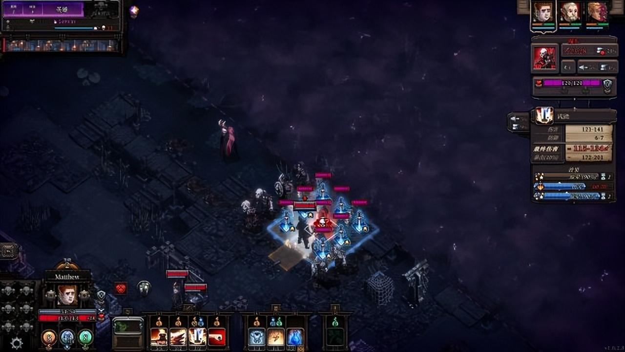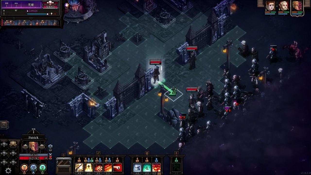右下会显示你所控制的英雄的属性和技能,使用技能需要消耗AP点和MP点,AP点每轮自动回复,而MP与HP需要使用药剂、触发特定被动技能或者完成当晚的战斗来回复——尽可能高效的使用AOE、形成技能的联动、高效的利用伤害(比如用手弩这样低伤害多段数的方式来补刀AOE留下的残血敌人)、适当的利用英雄分摊伤害和吸引僵尸走位。