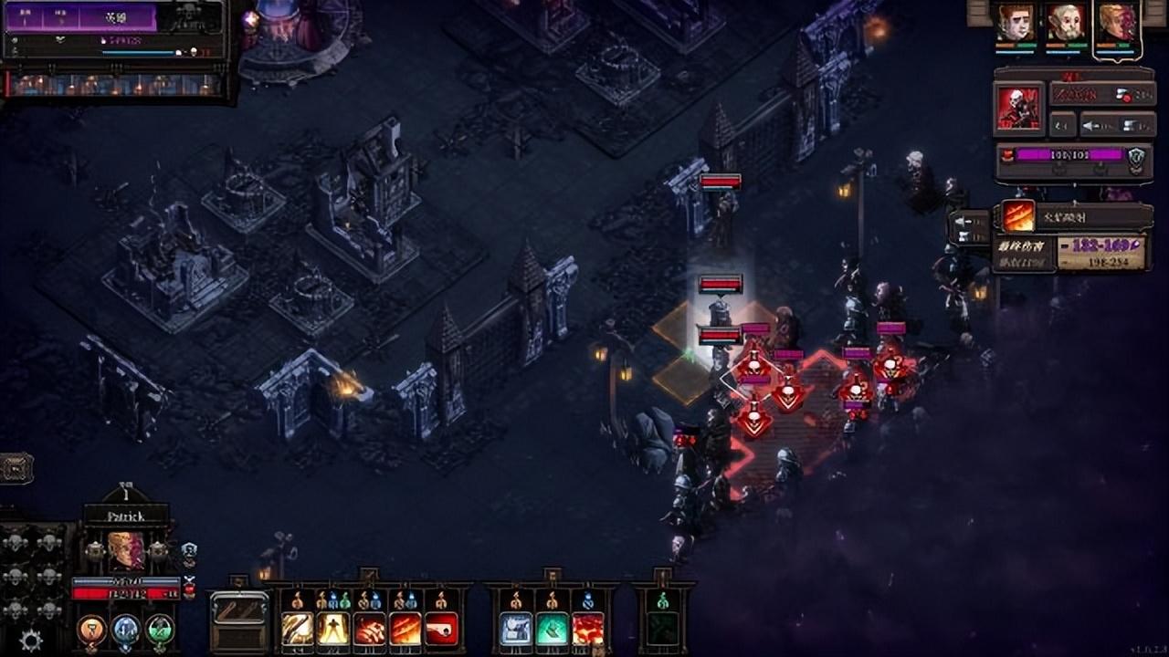 总而言之,这是一个“抢轮次”的游戏,如果你的输出能力不足以匹配丧尸的生成速度,那么丧尸群一定是不断向着核心的咒语区域推进的,而能为你争取时间的,则是各种建筑物(包括之前基地内的断壁残垣)。而在屏幕的右方可以查看你瞄准的敌人的信息,包括血量、移动能力、护甲、抗性和闪避率(回合制游戏90%几率MISS是真的会要了卿命)等。