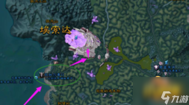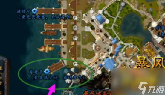 如图所示联盟玩家们回到暴风城然后走到暴风城港口,在地图左下角港口位置坐船到达纳苏斯鲁瑟兰村。坐船到达纳苏斯鲁瑟兰村后按照上图所示在港口最左边码头坐船。这个船的目