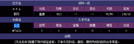 39、兵符,[无法丢弃]隐藏于荆州城宝座前,不拿兵符的话,襄阳、彝陵两战的敌防会非常高。