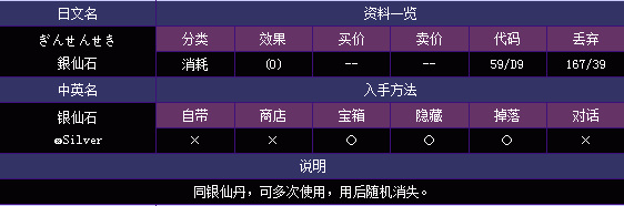 12、银仙石,同银仙丹,可多次使用,用后随机消失。