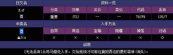 42、酒,[无法丢弃]从司马徽处入手,交给庞统才可前往襄阳西边的菱形森林(消失)。