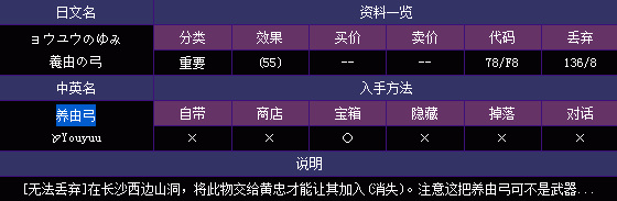 41、养由弓,[无法丢弃]在长沙西边山洞,将此物交给黄忠才能让其加入(消失)。注意这把养由弓可不是武器