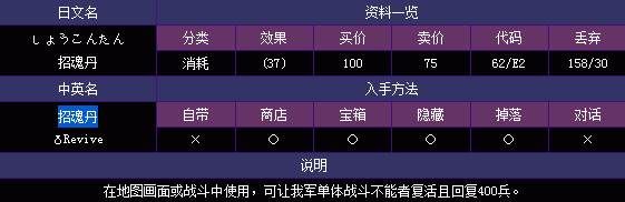 19、招魂丹,在地图画面或战斗中使用,可让我军单体战斗不能者复活且回复400兵。