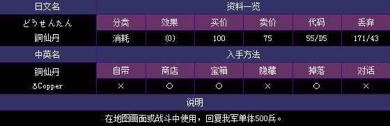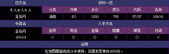 10、金仙丹,在地图画面或战斗中使用,回复我军单体4500兵。