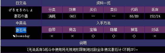 22、激石书,[无法丢弃]战斗中使用将无视地形限制地对敌全体使出激石计(不耗SP)。